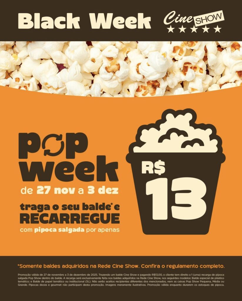A tradicional Black Week do Cine Show Volta Redonda ganhou um novo nome e um sabor especial. De 27 de novembro a 3 de dezembro de 2025, a rede realiza a Pop Week, uma ação promocional que oferece recarga de pipoca salgada por apenas R$ 13 para quem levar ao cinema o seu balde oficial Cine Show.