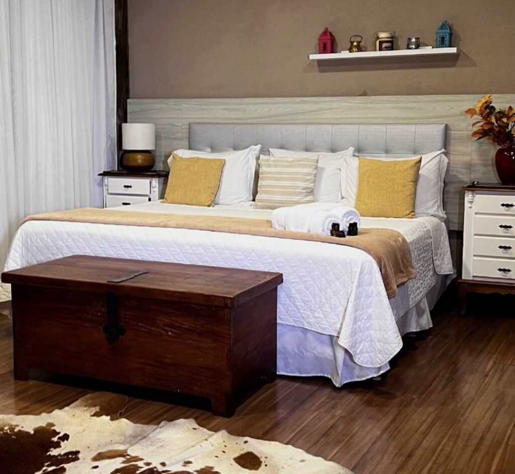 Entre as escolhas mais desejadas, o Apartamento Superior com Mezanino traz atmosfera contemporânea com pé-direito duplo e vista privilegiada; o Chalé Família se destaca pelo espaço e pela hidromassagem na varanda; já as Suítes Deluxe combinam sofisticação e praticidade com banheira, mini-cozinha e acesso facilitado à área da piscina. O enxoval refinado e os acabamentos de alto padrão reforçam a sensação de exclusividade.
