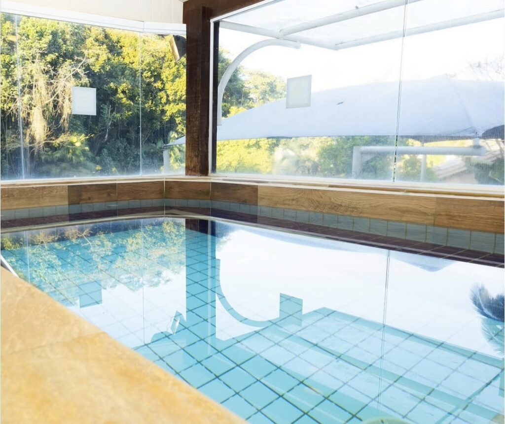 Nas áreas comuns, o ritmo é outro. Piscina aquecida, sauna, academia e jardins cuidadosamente projetados convidam ao descanso sem pressa. Redes espalhadas entre o verde e o silêncio da serra criam cenários perfeitos para desconectar, um luxo contemporâneo que valoriza o tempo e a presença.